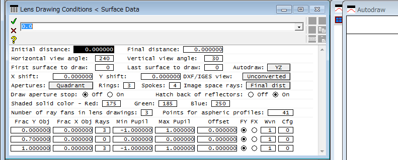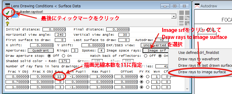 Lens Drawing Conditionsスプレッドシート内で: Image space raysの後で:Draw rays tio image surfaceを選択します。