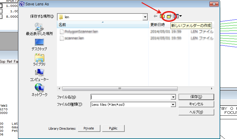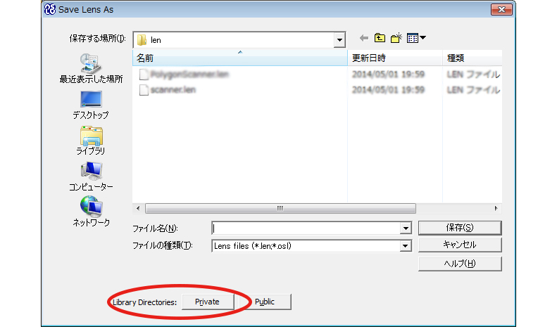 Save Lens Asウインドウの最下部のラベルLibrary DirectoriesとあるボタンのうちPrivateをクリックします。