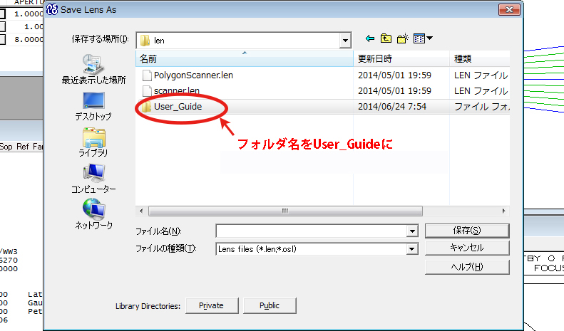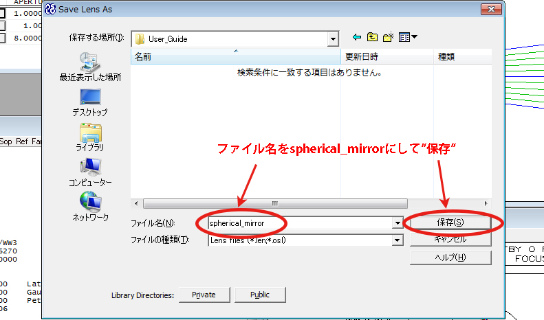 レンズはプライベートレンズディレクトリ、C:\Users\Public\Documents\OSLO66 Premium\private\len内に新たに作成されたサブディレクトリ、\User_Guide内に保存されます。