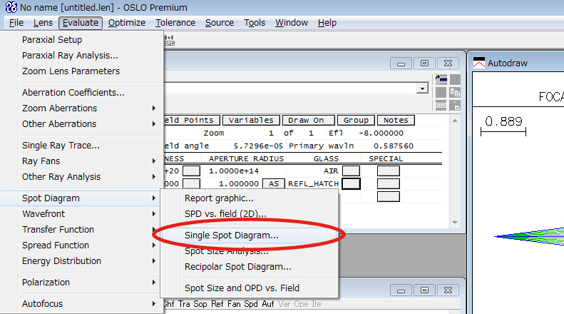 - EvaluateメニューヘッダからSpot Diagram▶Single spot diagram...を選択します。