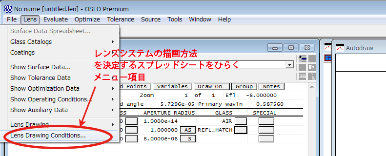 メインウインドウでLensメニューヘッダをクリックし、表示されるメニューリストから最後の項目のLens Drawing Conditions...を選択します。