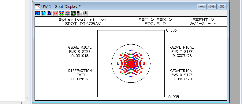 このダイアグラムで最も重要なことは全ての光線がこの円内に到達していることで、設定した系の性能が収差ではなく回折で制限されることを示唆しています。