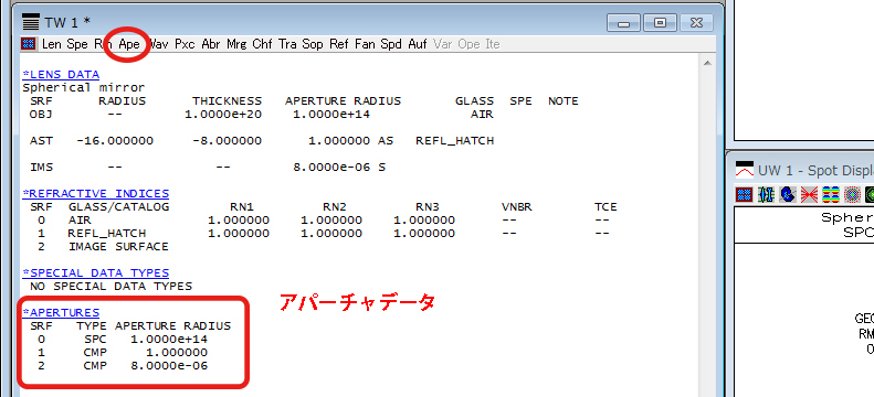 Apeヘッダをクリックすると設定してある全てのAperture(アパーチャ)がリストされます。
