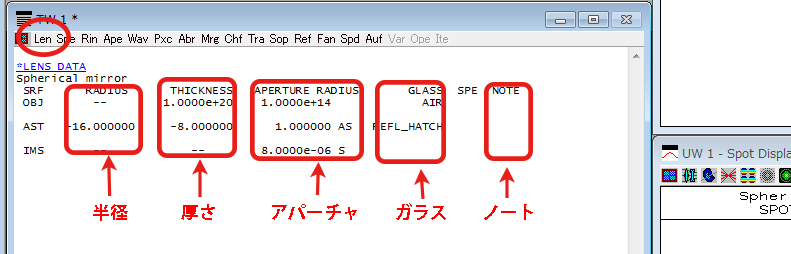 テキストウインドウで操作をしてみましょう。Lenヘッダをクリックするとradii(曲率半径)、thickness(厚さ)、aperture(アパーチャ)、glass type(ガラスタイプ)、surface note(サーフェスノート)がリストされます。
