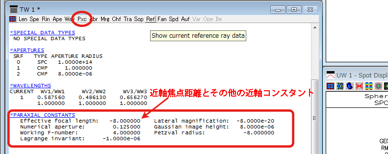 Pxcヘッダをクリックすると焦点距離と、動作条件がリストされます。