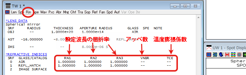 Rinヘッダをクリックすると設定波長でのガラス(媒質)の屈折率、アッベ数、温度膨張係数がリストされます。