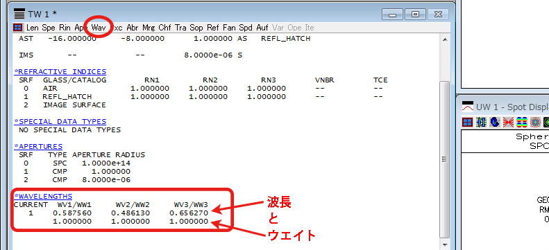 Wavヘッダをクリックすると設定してある全ての波長とその分光的なウエイティングファクタ(重み付けの係数)がリストされます。