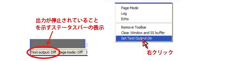 ここに”Text output Off”と表示されている場合はテキストウインドウ内を右クリックし、最後のメニュー項目:”Set Text Output On”を選択するとテキスト出力は表示されるはずです。